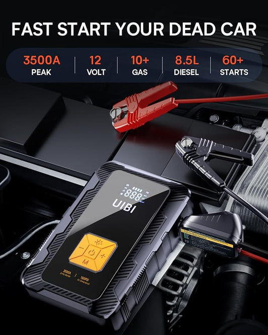 The UIBI 2500A Car Battery jump starter: Further upgraded product features,fast starting for 12V vehicles up to 8.0L gasoline/7.0L diesel. Doubles as a 59WH power bank with bi-directional Type-C and USB ports. Features high-brightness LED lights, smart large display, and 10 intelligent safety protections. Hassle-free 24-month warranty and lifetime support.