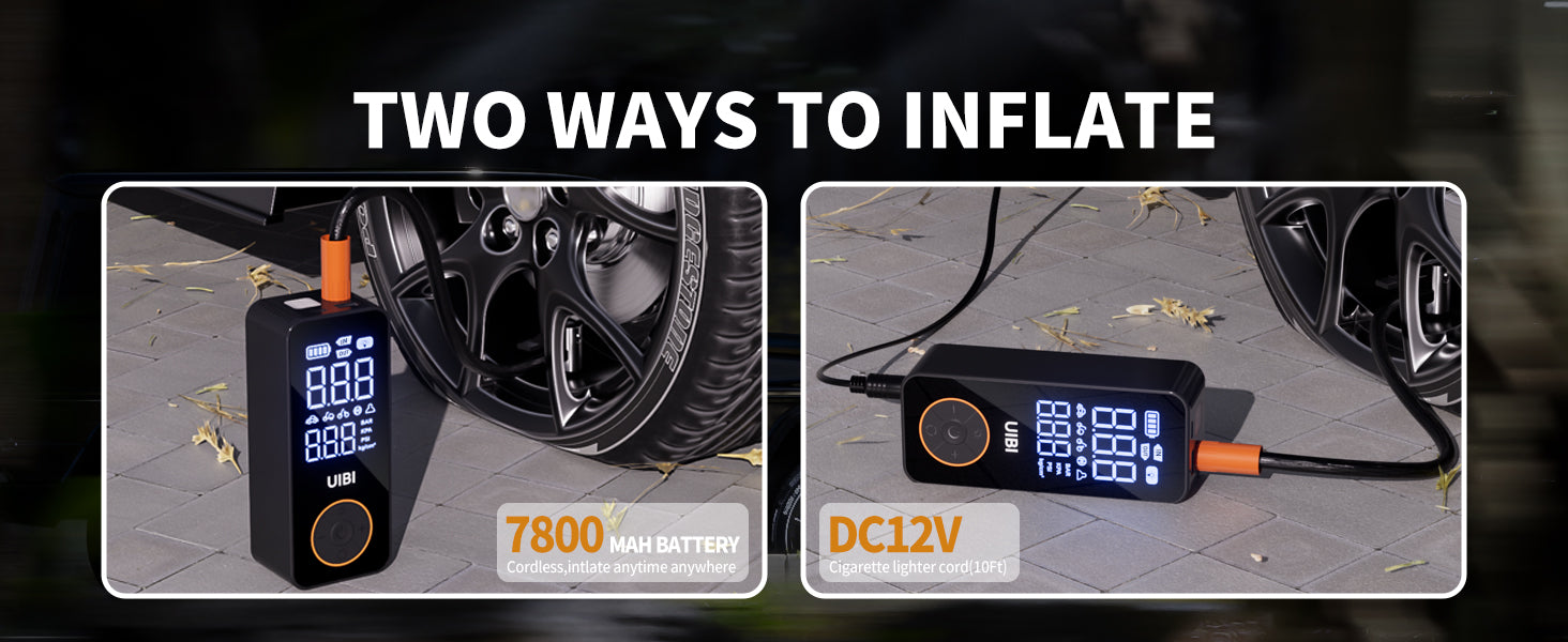 - 【Versatility at Its Best!】Our portable inflation pump is a true all-rounder, capable of not only inflating car tires but also suitable for motorcycles, bicycles, balls, and inflatable boats, thanks to the range of accessories included. Its innovative dual power design means there's no need for frequent recharging. Simply plug it into your vehicle's 12V DC outlet, and enjoy uninterrupted inflating power at your fingertips!