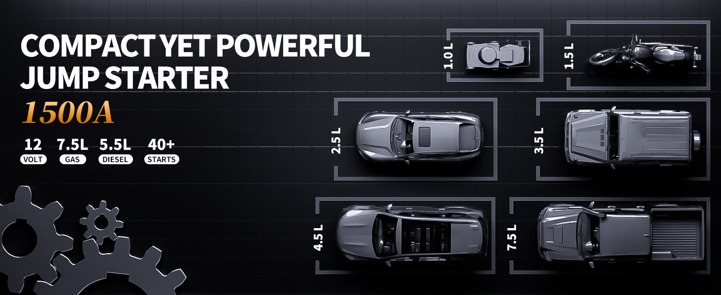 Powerful Performance: With 1500A peak current, it can start up to 7.5L gas or 5.5L diesel engines over 40 times on a single charge, even in extreme temperatures.