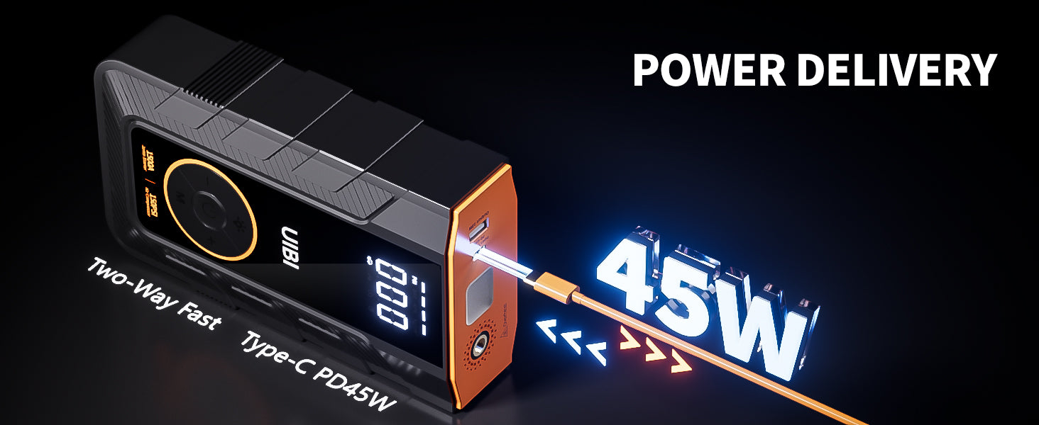 Fast Charging: Utilizes 45W USB-C input/output technology to charge devices three times faster than traditional jump starters.