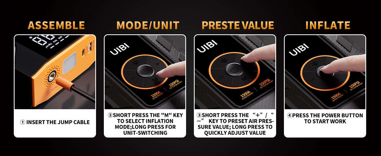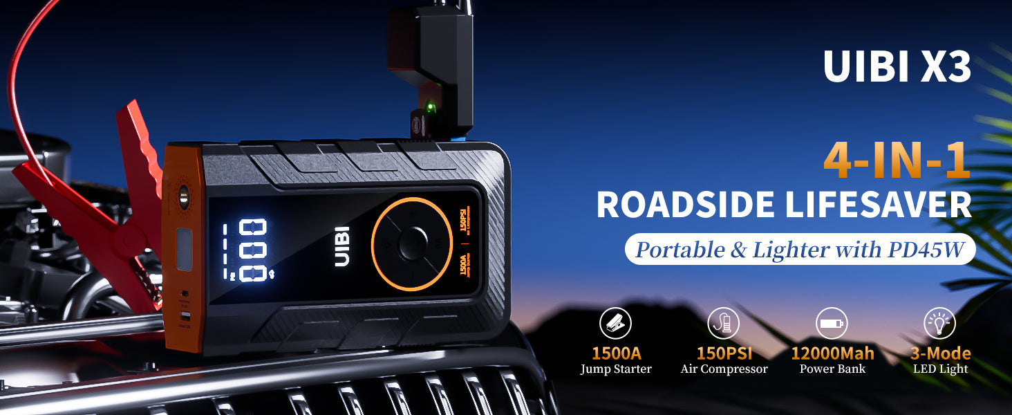 - 【Hassle-Free Service & Lifetime Tech Support】UIBI X3 portable battery jump box includes 1 x Jump Starter with Air Compressor, 1 x Smart Jumper Cable, 1 x USB-A to USB-C Charging Cable (not included wall charger), 1 x Carrying Bag, 1 x Pump Tube, 3 x Versatile Air Nozzles, 1 x Instruction Manual, and 12 months warranty. It makes for a perfect gift for birthdays, wedding anniversaries and Father's Day. Contact us if you have any questions, our expert team always stands by your side.