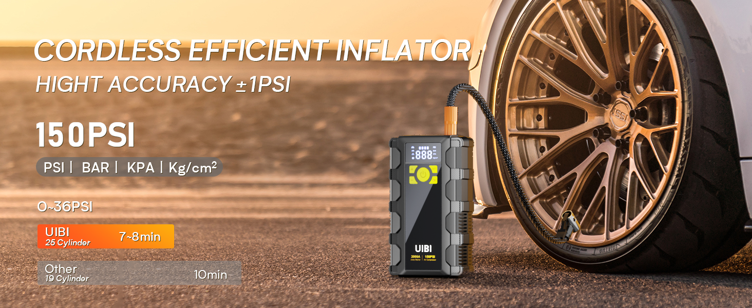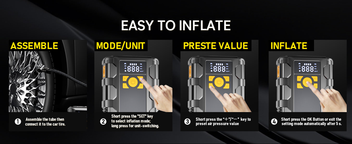 - 【Cordless Inflator with LED Display】The portable car battery charger jump starter with tire inflator, delivers a max pressure of 150 PSI. It monitors tire pressure in real-time with an accuracy within ±1 psi and auto shuts off when the preset value is reached, effectively inflating 4 tires from 0 PSI to 36 PSI. Including an extended air hose with three air inflation needles for inflating tires, bicycles, air beds, and sports balls. Additionally, the LED display ensures visibility in the dark.