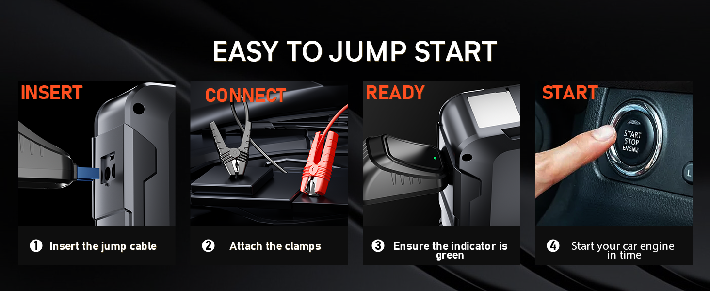 - 【High Security & Protection】The car battery jump starter built-in 10 intelligent safety protections, including spark-proof, short-circuit, high/low-temp protection, etc. This battery booster prioritizes safety and ease of use. It is not only certified by UL-2743 but also has a jumper indicator that automatically alarms under abnormal conditions to fully protect you and your car from any improper operations.
