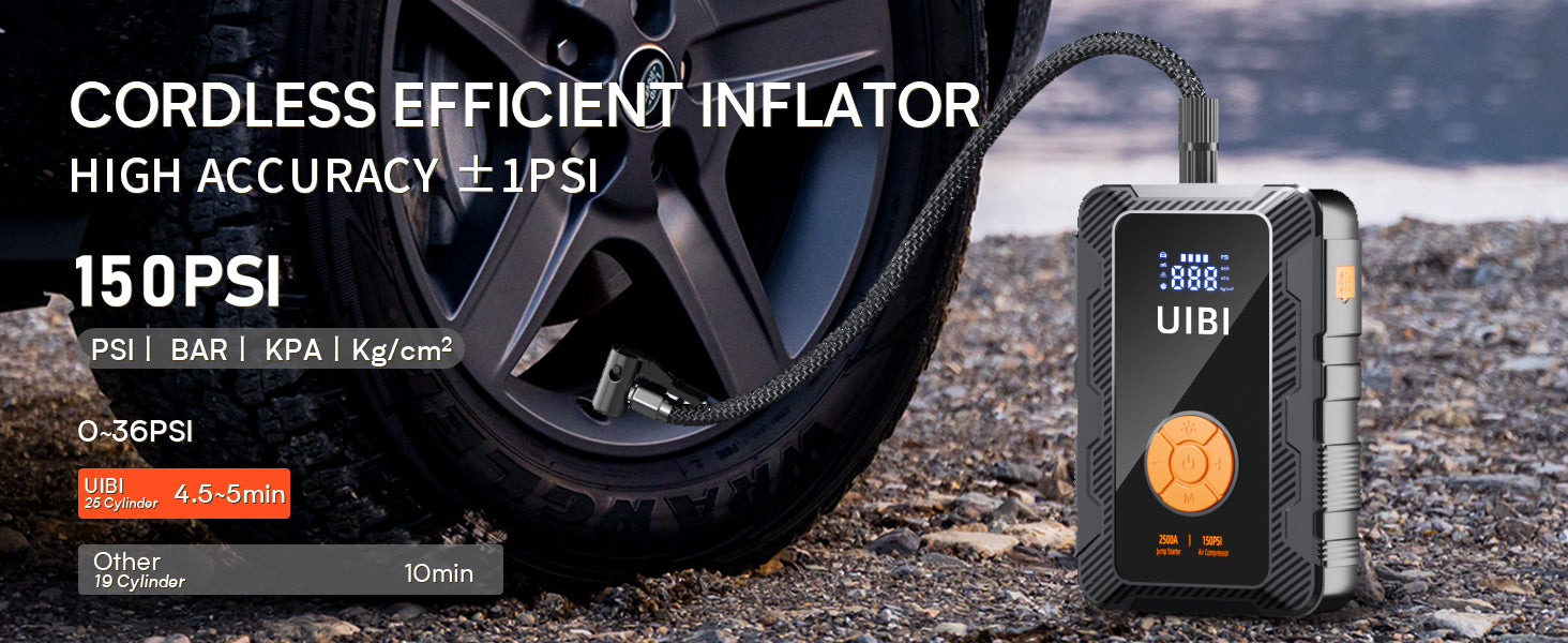 - 【Super Fast Cordless Inflation】 The tire inflator and battery jumper support tire pressure detection and smart preset. You can directly read real-time pressure from the LCD display whether inflating tires of cars/bikes/motorcycles or basketballs, etc. And preset modes, value or switch units (PSI, BAR, KPA, Kg/cm²). It automatically shuts off when the pressure is reached. The 150 PSI tire inflator only takes about 2mins to inflate an average car tire to 20 PSI that 2 times faster than others.